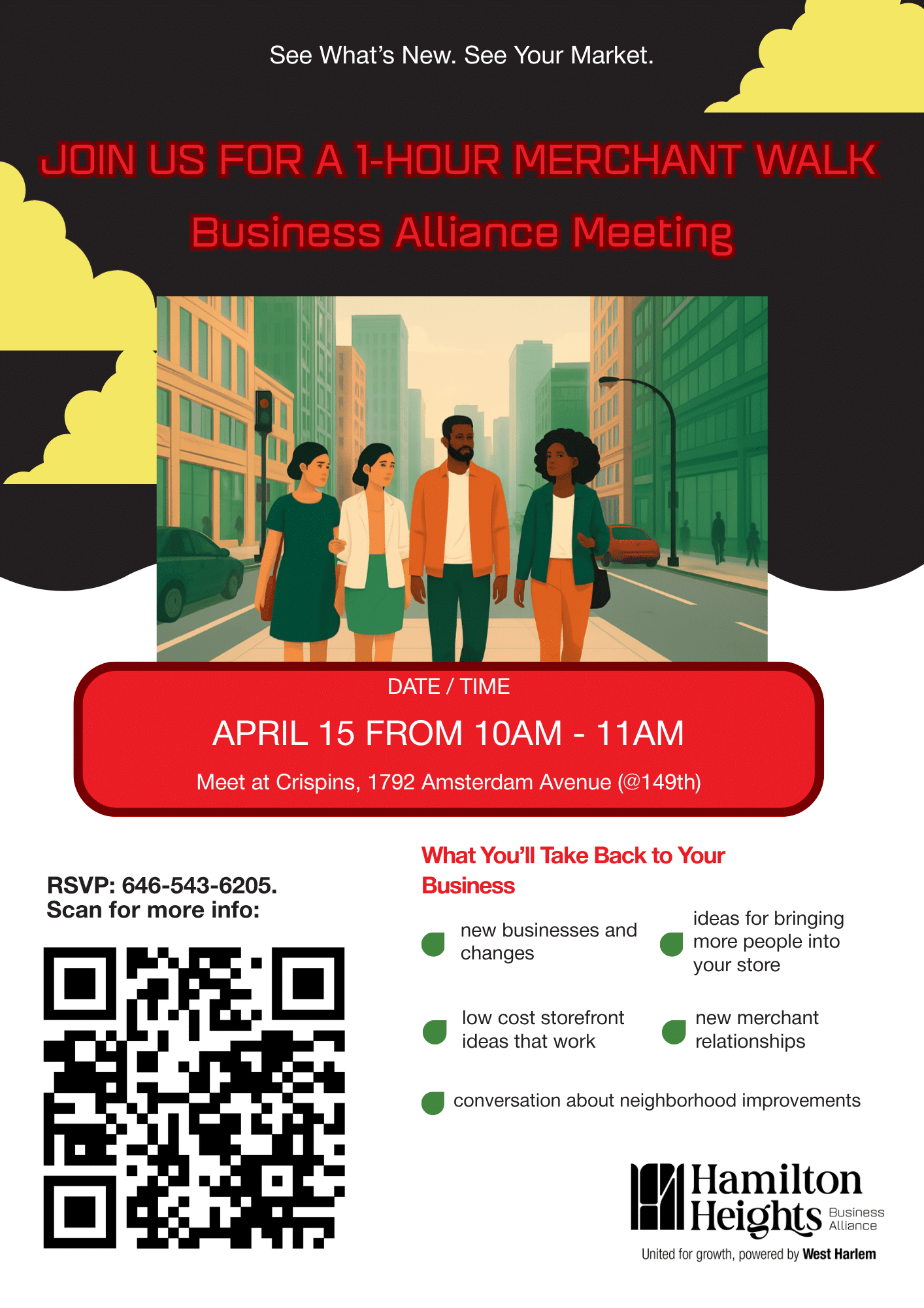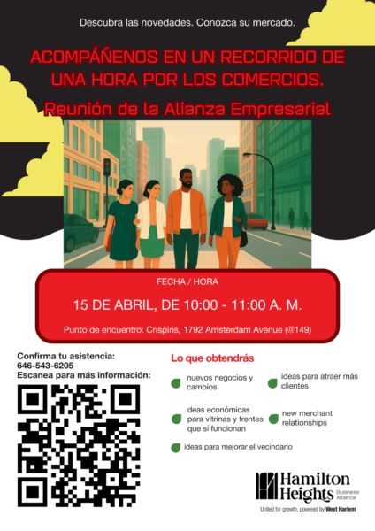 Alliance Meeting April 15 at 10AM – 11AM RSVP Tags: merchant-meetings Date Apr 15 2026 Expired! Time 10:00 am - 11:00 pm Meeting Format In Person - English,In Person - Spanish Location Crispin's 1792 Amsterdam Ave, New York, NY 10031 Category Alliance EventsMeetings Organizer Hamilton Heights Business Alliance