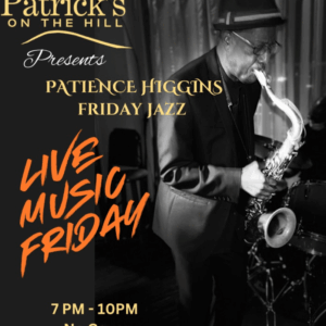 Live Jazz. Cocktails. Friday Nights. Patience Higgins live at Patrick’s on the Hill. 7PM, No cover.