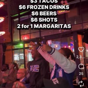 Happy Hour 4-8PM. $2 wings, $3 tacos, $6 frozen drinks-beers-shots, @ for 1 margaritas.